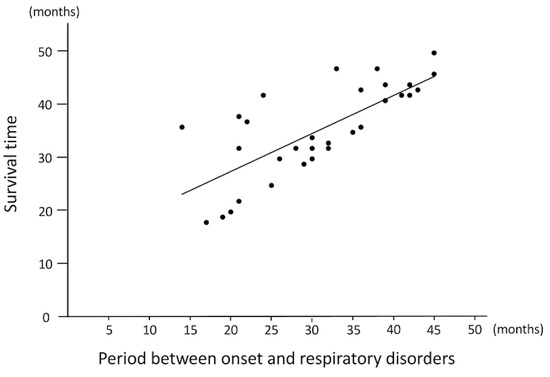 In patients with ALS, death is usually caused by respiratory failure owing to the loss of motor neurons supplying innervation to the diaphragm and chest wall muscles [22]. Moreover, dogs affected by DM are known to exhibit respiratory muscle disorders and respiratory dysfunction [12,13]. Our results demonstrate that respiratory dysfunction occurs in many dogs with DM, and this is the first report to indicate a relationship between the survival time and breathing impairment of dogs with DM.