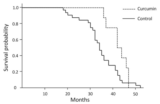 The survival time of the curcumin-treated group (n = 8) was significantly longer than that of the control group (n = 32; p = 0.04 by log-rank test).