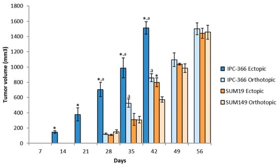 After the emergence of tumors, their progression was monitored to observe if there were differences between ectopic and orthotopic models. Tumor progression with IPC-366 and SUM149 cell lines was similar (Figure 1). Both cell lines exhibited rapid growth in vivo, reaching a volume of 1500 mm3 approximately 6–8 weeks after injection; it was significantly earlier in the IPC-366 ectopic model (p < 0.05), which reached final volume 6 weeks after injection (Table 1).