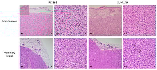 IPC-366 and SUM149 xenotransplanted mice, paraffin sections, H-E. (A) IPC-366 ectopic xenotransplanted mice. Neoplastic cells arranged in solid masses separated by a scant fibrovascular stroma infiltrating the adjacent dermis (inset: neoplastic cells infiltrating adjacent dermis). (B) IPC-366 orthotopic mice. Unencapsulated and densely cellular mass extending into the adjacent adipose tissue. (C,D) Ectopic and orthotopic IPC-366 xenotransplanted mice. Tumors are composed of highly pleomorphic cells with marked anisocytosis and anisokaryosis. Binucleated cells are commonly seen (arrow). (E,F) Ectopic and orthotopic SUM149 xenografted mice. Solid tumors infiltrate the dermis and adipose tissue. No histological differences were found between the types of SUM149 xenografts. (G) Orthotopic SUM149 xenograft. Medium to large round cells with a moderate eosinophilic cytoplasm and large nuclei with one or more evident nucleoli. (H) Orthotopic SUM149 xenograft. Presence of neoplastic cells with an elongated and empty cytoplasm that displaced the nuclei to the periphery, suggestive of endothelial-like cells (ELCs) (arrow). Atypical mitoses were frequently seen (arrowhead).