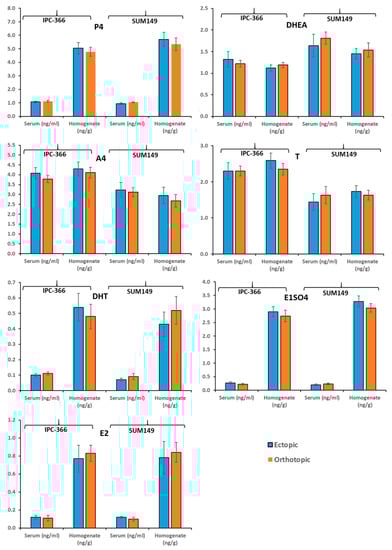 Steroid hormone secretion studied (P4, DHEA, A4, T, DHT, E1SO4, and E2), on ectopic (subcutaneous) and orthotopic (mammary fat pad) models of IPC-366 and SUM149 xenografts.
