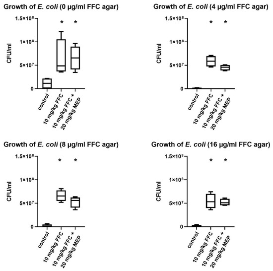 Rectal faecal samples were taken to evaluate the treatment effect of FFC and FFC combined with MEP on the commensal microbiota of pigs. On day 0, coliform colonies were found on all plates of the 10−3 dilution, as well as on day 6 in the controls (group 1). There was no coliform growth on the plates supplemented with 4, 8 and 16 µg/mL FFC.