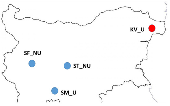 Map showing the locations of 20 honey samples in Bulgaria. Sample names indicate the region in Bulgaria (SF, Sofia City Province; SM, Smolyan; ST, Strelcha; KV, Kavarna). Habitat indicator (U, urban area; NU, non-urban area). Blue circles—polyfloral honey; Red circle—monofloral honey.