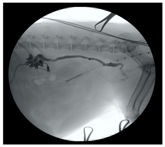 Complications of ureteral stenting may include ureteral or vascular injury, local tissue reaction to the stent with subsequent tissue overgrowth, vesicorenal reflux, stent encrustation, pyelonephritis, bladder irritation, migration, and compression resulting in reobstruction [1,3,21]. Technical success (often defined as placement of the stents using an interventional technique) is generally considered very high, with most percentages being >94% in humans [2,3]. Ureteral stents appear to be better tolerated in companion animals and rarely require exchange when placed for malignancy. In one study evaluating outcomes associated with percutaneous antegrade ureteral stenting for malignancy in dogs, the technical success rate was 100%, and all dogs demonstrated an improvement in azotemia prior to discharge from the hospital [20]. Additionally, in the 10 dogs that underwent post-stenting ultrasonographic examination, improvement in hydronephrosis and ureteral dilation was noted [20].