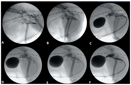 In female dogs and cats, a guidewire is introduced into the vulva and directed toward the urethral orifice. If access into the urethral orifice is challenging, cystoscopic guidance can be utilized to facilitate guidewire placement. A 6–8 French vascular access sheath is placed over the guidewire and advanced into the urethra. Using the side-arm of the sheath, the bladder is filled with a 50%/50% mixture of iodinated contrast/saline. A contrast cystourethrogram is then performed by injecting into the sheath while pulling the sheath from the bladder and out of the urethra; the guidewire is left in position within the bladder during the procedure. The rest of the procedure is performed as described above for male dogs.
