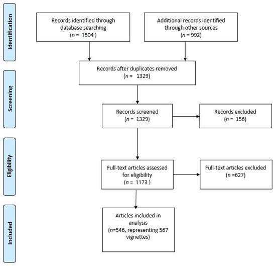 Web of Science (all databases) and PubMed searches returned 862 and 641 records, respectively, a total of 1503 records (Figure 1). A Google Scholar search yielded 992 hits. At this stage there were a total of 2495 records, of which 1166 were duplicates. Therefore, 1329 records were screened. After screening, based on the title, abstract, or full text, there were 546 articles containing 567 vignettes (for bibliographic information, see Supplementary Material S1). Figure 1 provides a flow diagram of the literature searches.