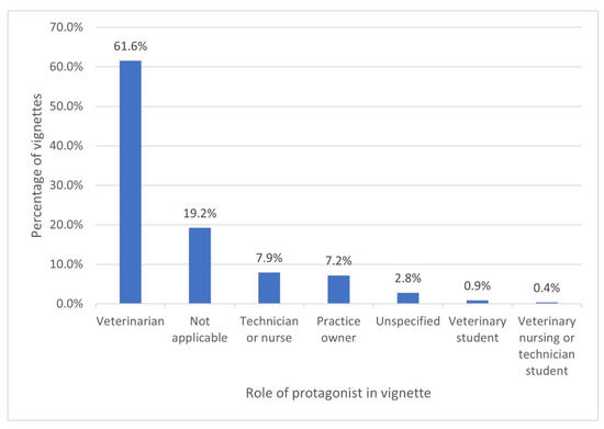 The role of the protagonist in each vignette is presented in Figure 2. The majority of vignettes described ECS faced by veterinarians (61.6%, n = 349). In addition, where the protagonist was a practice owner (7.2%, n = 41), veterinarian practice owners were specified in the majority (87.8%, n = 36) of these vignettes. The next most frequent category was “not applicable” (19.2%, n = 109).