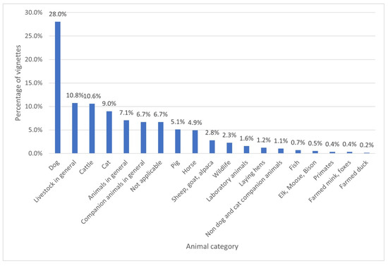 Companion animals (“dogs”, “cats”, “companion animals in general”) and livestock (“livestock in general” and “cattle”) accounted for the majority of species or category of animal depicted in vignettes, probably because veterinary team members are most likely to encounter these groups of animals. The prevalence of companion animal-related vignettes may reflect the reality that, in most western countries, the majority of veterinary teams care exclusively or mostly for companion animals or small animals [46,47,48,49,50,51]. Dogs may have featured more prominently in vignettes due to a perception that they form strong affiliative bonds with humans, who are responsive to the canine gaze [58]. Dog owners may also have stronger bonds than cat owners, be more likely to seek veterinary attention for them, and consider more costly (and potentially more involved) intervention when compared with cat owners [59,60]. Dogs may feature more prominently than cats as owners of cats may avoid taking them to veterinary clinics due to “feline resistance” to carriers or transportation, and fearful behaviour in veterinary settings [61].