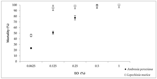 Mortality of Rhipicephalus microplus larvae treated with essential oils of Ambrosia peruviana or Lepechinia mutica. Results are presented as mortality values of 10 replicates as Abbott [27] ±5% error.