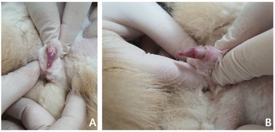 Non-ischemic priapism in a 14-year-old neutered male British shorthair. The penile tip is dry and shows a soft erection (A,B).
