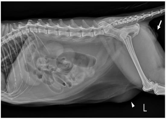Left lateral abdominal radiograph in a cat revealed edema of the perineal region (white arrows). The cutaneous mass with fat opacity in the inguinal region (white arrowheads) was cytologically suspected as a lipoma.