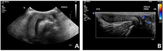 - Goericke-Pesch, S.; Hölscher, C.; Failing, K.; Wehrend, A. Functional anatomy and ultrasound examination of the canine penis. Theriogenology 2013, 80, 24–33. [Google Scholar] [CrossRef] [PubMed]