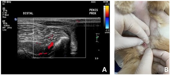 Ultrasonography in a cat with non-ischemic priapism (A) swollen penis with homogeneous parenchyma; (B) The color-flow Doppler examination did not clearly identify penile cavernosal artery blood flow due to the small size of the feline penis.