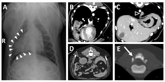 (A Soft tissue opacity (arrowheads) in the right middle lung lobe on thoracic radiography. (B) Large mass of the right middle lung lobe and (C) small mass of the left caudal lung lobe (open arrowhead) on post-contrast transverse images. (D) Small mass (open dashed arrowhead) dorsal to the right kidney. (E) Osteolytic lesion (arrow) of the T13. (R: right, T13: the 13rd thoracic vertebra).