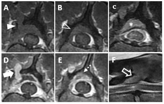 Magnetic resonance images showing a mass invading the vertebral canal and the spinal cord lesion are depicted. (A The mass appears iso-intense at the bone lysis region on a transverse T1-weighted image (arrowhead). (B) The mass can be seen invading the vertebral canal on a transverse T1-weighted image (open arrowhead). (C) The mass can be seen mildly compressing the spinal cord (asterisk) and contrast enhancement of the spinal cord parenchyma (dashed arrowhead) is visible on a post-contrast, transverse T1-weighted image. (D) Contrast enhancement of the mass (arrow) is shown on a post-contrast, transverse T1-weighted image. (E) The mass can be seen invading the vertebral canal on a post-contrast, transverse T1-weighted image (dashed arrow). (F) The mass (open arrow) between T13 and L1 causing hyperintensity of the spinal cord parenchyma is shown on a sagittal T2-weighted image. (T13: the thirteenth thoracic vertebra, L1: the first lumbar vertebra.).