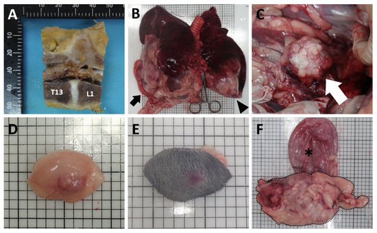 At necropsy, (A) recurrence of the mass was found between the T13 and L1. Additionally, the masses were found in the (B) right middle and caudal lobe (black arrow) and left caudal lobe (black arrowhead), (C) dorsal to the right kidney (white arrow), (D) falciform ligament, (E) skin, and (F) cranial (black dashed line) to the urinary bladder (asterisk).