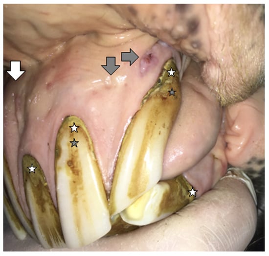 Case 2—the condition of the maxillary incisors before extraction. White stars—recessing gumlines, gray stars—excessive calculus deposition, red stars—gingivitis, gray arrow—fistula, red arrows—deformation of incisal processes.