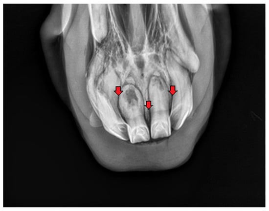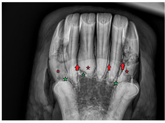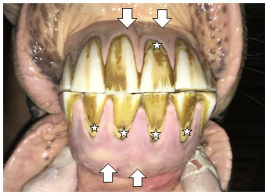A 20-year-old Polish Half-Bred gelding weighing 650 kg used for recreational purposes was subjected to an oral examination, during which the EOTRH syndrome was found on the basis of the clinical examination (Figure 1 and Figure 2). At the time of the horse’s examination, all general parameters were within physiological limits. The condition and maintenance of the horse was appropriate for its age and level of work. It is known from the medical history that the examination of the oral cavity and the correction of teeth in this horse were performed regularly, approximately every 12 months, although there is no detailed information about the possible correction of the incisors. EOTRH syndrome was not diagnosed in the previous years. During detailed examination of the incisal area of the mouth, the presence of a ventral curvature was found, created by the contact of the rubbing surfaces of the incisors of the maxilla and mandible. Compression of the outermost incisors of the maxilla and the mandible caused pain and the receding of the head as a defensive reaction of the animal. In addition, gingivitis on the labial and lingual surfaces of all incisors was found, as well as a clear gingival recession around teeth 101, 102, 103, 201, 202, 203, 303 and 403 according to the Modified Triadan system. Deformation of the labial surface in the area of the incisal processes was found on all incisors. Fistula openings were also present, located on the labial surface of the roots and reserve crowns of teeth 101, 102, 103, 201, 202, 203, 303, 401, 402, 403. Deposition of dental calculus was identified on the labial surface of teeth 101, 102, 201, 202, 203 and all mandibular incisors (especially corners). To confirm the EOTRH Syndrome, a radiological examination of the area of the incisal processes was performed in the following intraoral projections—dorsoventral (Figure 3) for the maxillary incisors and ventrodorsal (Figure 4) for the mandibular incisors. Additionally, a lateral projection of the incisal area was performed (Figure 5). On the basis of the obtained image, decreased opacity of the roots and reserve crown areas of the incisors, as well as lamina dura of the alveolar processes of maxillary incisors (especially the extreme ones) and of the mandibular incisors was found. Radiographs confirmed the presence of the advanced EOTRH Syndrome, with a predominance of the resorptive process. The process of excessive cement deposition was most evident in the area of the root and reserve crown of tooth 303. Further examination of the oral cavity was performed after thorough rinsing with water and application of a Hausmann speculum. A light source, dental mirror, and dental probe were then used to examine individual teeth. The examination of the oral cavity revealed calculus deposition and gingivitis with the simultaneous recessing of teeth 304 and 404, sharp edges of the cheek teeth in the maxilla and mandible, erosions of the cheek and tongue mucosa, and excessively protruding teeth 306 and 406. In the complete blood count, red and white blood cell parameters were within physiological limits, with the exception of slight fluctuations in individual parameters: lymphocytes—below normal (0.7 × 109/L), granulocytes—above normal (78.8%), hemoglobin—below normal (102 g/L).