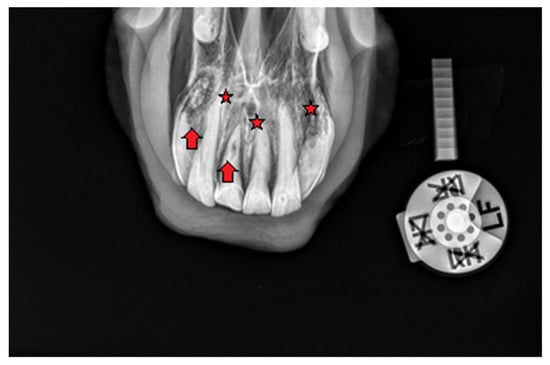 Case 1—intraoral radiograph of maxillary incisor teeth. Red arrows show areas of extensive resorption. Osteomyelitis of maxilla (red stars).