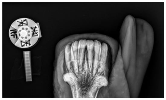 EOTRH syndrome was diagnosed in a 21-year-old Oldenburg gelding with a body weight of 700 kg and used for recreational purposes. It is known from medical history that the oral cavity inspection was performed regularly, every 12 months. If necessary, the dentition was corrected, consisting of the removal of sharp edges of the cheek teeth in the maxilla and mandible. There is no information on the possible correction of the incisors. The presented horse has never manifested any major health problems. As in case 1, EOTRH Syndrome was not previously diagnosed. At the time of the horse’s examination, all general parameters were within physiological limits. The condition and maintenance of the horse were assessed as appropriate. Detailed examination of the incisal area of the mouth showed the presence of a ventral curvature and a slight undershot bite. Compression of the corner incisors showed a painful reaction. Tooth 102 was missing. Gingivitis was recognized around teeth 103, 303 and 403. Gingival recession was found around teeth 101, 103, 201, 202, 203 and all mandibular incisors. In addition, the presence of closed diastema between teeth 202 and 203 was recognized, with a tendency to accumulate food content within it. Calculus deposition was found in the area of tooth 203. As in case 1, deformation of the labial surface in the area of the alveolar processes was found in all of the incisors present. A single fistula opening was located on the labial surface of the root area of tooth 201. Based on a detailed examination of the area of the incisal processes, the diagnosis of EOTRH Syndrome was made (Figure 6). The radiographs of the incisal area were made in the same way as in the case of 1. The following changes were recognized: decreased opacity of the apical part of the root, significant widening of the periodontal ligament space (especially within the central incisors of the maxilla and mandible), root resorption (especially the extreme mandibular incisors), extensive hypercementosis of the reserve crowns and roots of all incisors, loss of lamina dura osteitis of the alveolar processes of the maxilla and mandible (Figure 7, Figure 8 and Figure 9). Examination of the rest of the oral cavity revealed calculus deposition and gingivitis with simultaneous gingival recession of teeth 304 and 404, sharp enamel points on the buccal side of the maxillary cheek teeth and lingual side of the mandibular cheek teeth, erosions of the cheek and tongue mucosa, excessively protruding teeth 306 and 406, and inactive infundibular caries of teeth 109 and 209. The blood count results were within acceptable standards.