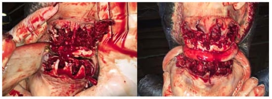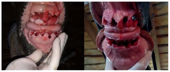 The condition of the tooth extraction sockets during the first change of alveolar dressings 9 days after the procedure (on the left—case 1, on the right—case 2). The horse undergoing hyperbaric oxygen therapy (case 1) had less swelling, faster gingival shrinkage and faster filling of the alveoli with granulation tissue.