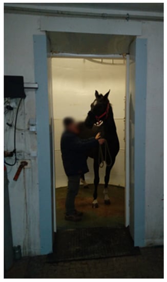 A hyperbaric chamber with a diameter of 3 m and a capacity of 40 m2 was used in the therapy (Figure 13). The therapy included the supply of 40% oxygen, 2% carbon dioxide and 0.5% hydrogen at a pressure of 1500 hPa for 90 min. The use of the chamber by the horse from case 1 took place daily from the day of surgery for 25 days. The horse was not previously prepared or trained to stay in the chamber. The horse was brought inside the chamber and remained without sedation. The conditions in the chamber reflected the stall environment, the horse did not need to be tied down and could move freely inside. During therapy, however, the horse did not have access to water and food.