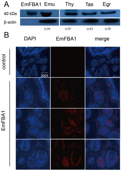 Localization of EmFBA1. (A) Western blotting analysis of natural FBA1 in E. multilocularis and other tapeworms. Emu, E. multilocularis; Egr, E. granulosus; Tas, Taenia asiatica; Thy, Taenia hydatigena. (B) Localization of EmFBA1 in E. multilocularis cyst. The localization of EmFBA1 was indicated by red arrows. In these experiments, healthy rabbit serum was used as a control.