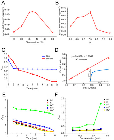 Enzyme kinetics of EmFBA1. (A) Effects of temperature on the enzyme activity. At 10 min after reaction, absorbance values at 340 nm were recorded at a different temperature. (B) Effects of pH on the enzyme activity. At 10 min after reaction, absorbance values at 340 nm were recorded at a different pH. (C) The enzyme activity of EmFBA1. The reaction was conducted in 50 mM Tris-HCl (pH 7.5) at 37 °C for 10 min, and absorbance values at 340 nm were recorded at an interval of 1 min. (D) Determination of Km and Vmax of EmFBA1. (E) Effects of ions on the enzyme activity of EmFBA1. (F) Effects of ions at a different concentration on the enzyme activity of EmFBA1.