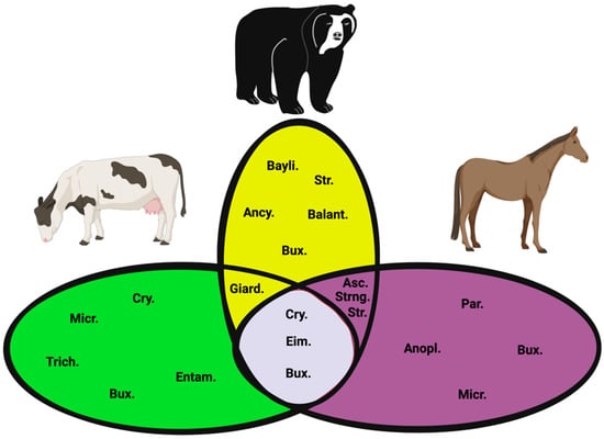 Zárate Rodriguez, P.T.; Collazos-Escobar, L.F.; Benavides-Montaño, J.A. Endoparasites Infecting Domestic Animals and Spectacled Bears (Tremarctos ornatus) in the Rural High Mountains of Colombia. Vet. Sci. 2022, 9, 537. https://doi.org/10.3390/vetsci9100537