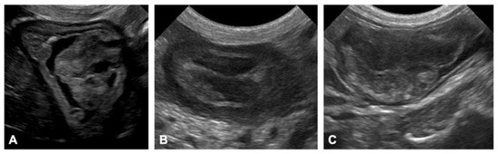 Ultrasonographic images of tumors in the digestive tract of Jack Russell Terriers with hereditary gastrointestinal polyposis. (A) Gastric polyps present as cauliflower-like polypoid lesions protruding into the lumen, with a stalk continuous with the mucosa. (B) Circumferential masses are observed as a thickening of the bowel wall in the duodenum. (C) Large polypoid lesions protruding into the lumen of the ileum or jejunum; this lesion does not invade the polyp base and the muscularis propria is detectable.