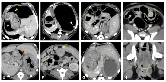 On CT images, many gastric masses appeared as cauliflower-like tumors with stalks continuous with the mucosa (Figure 2A,E,G). In most cases, small intestinal masses were observed as a thickening of the bowel wall (Figure 2C); however, polypoid masses were rarely observed (Figure 2D). Although it was sometimes difficult to distinguish colorectal masses from surrounding fecal masses on plain images, contrast-enhanced images enabled us to distinguish them (Figure 2H). On contrast-enhanced images, the mass exhibited enhancement comparable to that of the mucosa (Figure 2B–D) and the large GI mass was heterogeneously enhanced (Figure 2A,G,H). Compared with other GI tracts, it was more difficult to assess the exact number of masses and their boundaries with the normal mucosae in the colorectum, even on contrast-enhanced images.