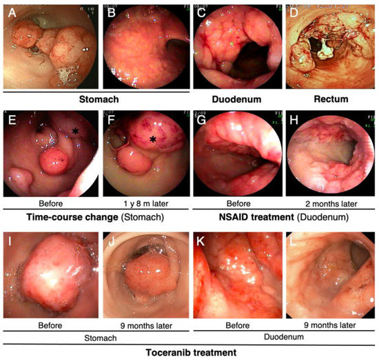 Endoscopic images of tumors in the digestive tract of Jack Russell Terriers with hereditary gastrointestinal polyposis. (A) Representative images of polypoid lesions in the pyloric antrum of the stomach. The pylorus is narrowed by the multiple protruding tumors and is therefore less-visible. (B) Mucosal thickening of the gastric body. (C) Duodenum lesion developed circumferentially. A CT image of the same lesion is shown in Figure 2C. (D) Polypoid lesions of the rectum. Numerous polypoid lesions protrude into the lumen, and bleeding from the masses and surrounding mucosa can be observed. (E,F) Time-course changes of the gastric lesions. The images were taken after an interval of 1 year and 8 months. Asterisks indicate substantial tumor growth during this period. (G,H) Time-course change in the duodenal lesion during nonsteroidal anti-inflammatory drugs (NSAIDs) therapy. The images were taken before (G) and after (H) NSAIDs treatment for 2 months. NSAIDs reduced edematous swelling and hyperemia of the duodenal tumor and surrounding mucosa (H). Regrowth of this lesion was observed 1 year and 6 months after cessation of NSAIDs therapy, as shown in Figure 3C. (I–L) Time-course change during toceranib treatment of gastrointestinal lesions in the (I,J) stomach and (K,L) duodenum. The images were taken before (I,K) and after (J,L) toceranib treatment for 9 months. Toceranib treatment resulted in tumor shrinkage and improvement of mucosal thickening and bleeding in the both stomach and duodenum.