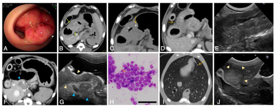 Diagnostic imaging of invasive gastrointestinal tumors in Jack Russell Terriers with hereditary gastrointestinal polyposis. (A) Endoscopic appearance of an invasive gastric tumor. Case M. (B–D) Computed tomography (CT) images of an invasive gastric tumor. Case M. (B) On contrast-enhanced CT images, the mucosal layer is visualized as enhanced lines in the thickened gastric wall (yellow arrows). (C) Intramural foci of calcification (yellow arrow) is observed on noncontrast CT image. (D) A furrowed image suggestive of tumor invasion or severe inflammation (yellow arrow) can also be observed outside the gastric wall. (E) Ultrasonographic image of an invasive ileum tumor. Case A. Marked wall thickening and destruction of laminar structure by the loss of muscularis propria are evident compared with an image of a noninvasive ileal carcinoma in Figure 1C. (F–H) Lymph node metastasis of the gastric tumor. Case M. On CT image (F) and ultrasonography (G), enlargement of the lymph nodes near the body of the stomach are detectable (blue arrowheads). On ultrasound image (G), loss of the laminar structure in the thickened gastric wall can be observed (yellow arrowheads). In fine needle aspiration of the lymph node (H), clusters of atypical epithelial cells are detected, demonstrating metastasis of the tumor cells. The yellow arrow indicates a tumor cell with an enlarged nucleus. Bars = 50 µm. (I) Pulmonary nodules (yellow arrow) found by CT scan in the case with invasive gastric tumor. Case M. (J) Intrahepatic nodules detected by ultrasound in the case with an invasive ileal tumor. Case A.
