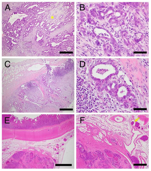 Histopathology of invasive gastrointestinal tumors in Jack Russell Terriers with hereditary gastrointestinal polyposis. (A–D) Photomicrographs of the invasive gastric adenocarcinoma. Case M. Invasion into the submucosal and muscular layers (A,B) and metastasis to the regional lymph node (C,D). The asterisk indicates the focus of the calcified osteoid in the interstitium (A). (B,D) are higher magnification images of the boxed areas in (A,B), respectively. (E,F) Photomicrographs of the invasive adenocarcinoma in the ileum. Case A. Invasion into the mesentery (E). (F) is a higher magnification of the boxed area in (E). Arrow indicates lymphovascular invasion of the tumor cells. Bars = 2 mm (E), 500 µm (A,C,F), 50 µm (B,D).