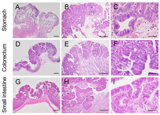 Histopathology of the gastrointestinal tumors in Jack Russell Terriers with hereditary gastrointestinal polyposis. (A–C) Representative photomicrographs of gastric adenocarcinoma. (B,C) Higher magnification of the boxed area in (A,B). The lesion was diagnosed as tubulopapillary adenocarcinoma. (D–F) Representative photomicrographs of colorectal adenocarcinomas. (E,F) Higher magnification of the boxed area in (D,E). The lesion was diagnosed as papillary adenocarcinoma. (G–I) Representative photomicrographs of jejunoileal adenocarcinomas. (H,I) Higher magnification of the boxed area in (G,H). The lesion was diagnosed as papillary adenocarcinoma. Note that the gastrointestinal tumors proliferate mainly in the upper epithelial layer without invasions into the deeper layers. Bars = 2 mm (A,D,G), 500 µm (B,E,H), 200 µm (C,F,I).