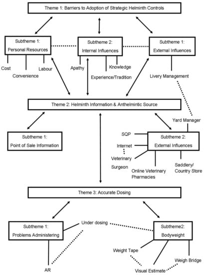 Three main themes were evident and further divided into subthemes during analysis: (1) barriers to adoption of strategic controls; (2) helminth information and anthelmintic source, and (3) accurate dosing. In order to illustrate the themes, subthemes, and categories, and to express their inter-relationships, a thematic map was created to aid exploration and understanding and illustrate understanding of the data (Figure 1). Mapping the data also helped to develop the structure and provide meaning to the themes.