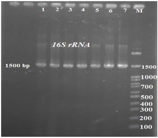 16S rRNA PCR products. (1–7: samples 1 to 7; M: marker 100 bp).