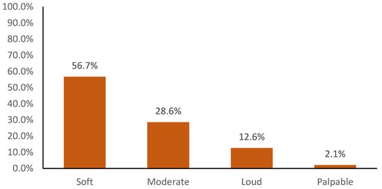 Intensity: the majority of cats displayed a soft murmur (56.7%), followed by moderate (28.7%), loud (12.6%) and palpable (2.1%) (