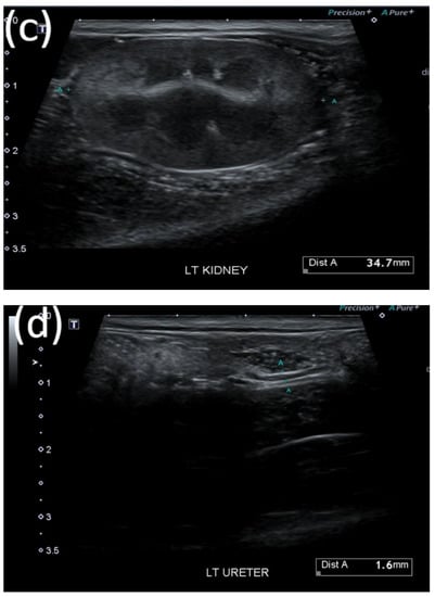 Representative ultrasound image of successful stone passage in a cat. (a) Dilated renal pelvis owing to obstruction and (b) high-contrast material presumed to be a stone in the distal part of the ureter. (c,d) After tamsulosin therapy, improved renal pelvic dilation and successful stone passage were confirmed through ultrasound imaging.