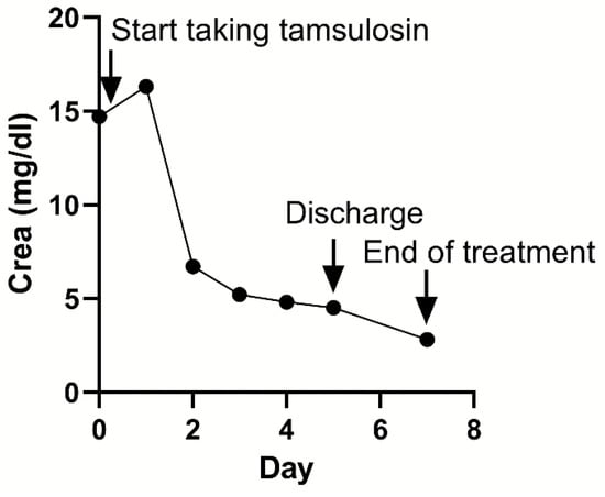 A known adverse event of tamsulosin is a sudden drop in blood pressure, which can cause dizziness or fainting [,]. However, no studies have been conducted to investigate the safety and adverse effects of tamsulosin in cats. For this reason, many cases were prescribed with a small initial dose referring to the dose cited in a drug book []. During the treatment period, serial monitoring was performed for possible adverse events such as a sudden drop in blood pressure after receiving tamsulosin. In addition to the sudden drop in blood pressure, adverse events known to occur when using tamsulosin in humans, such as vomiting and severe allergic reaction, were carefully monitored [,].