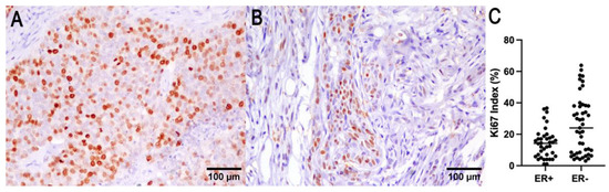 Ki67 (A) and ER (B) immunohistochemistry of a representative CMC. (C) ER expression was found to be correlated with a lower Ki67 index.