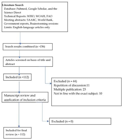 The literature review was carried out for eight SAARC member countries, namely, Afghanistan, Bangladesh, Bhutan, India, the Maldives, Nepal, Pakistan, and Sri Lanka. Technical reports from the World Health Organization (WHO), World Organization for Animal Health (WOAH, formerly known as OIE), FAO, SAARC Secretariat, and World Bank websites were included in the review. The government websites and published reports from the respective countries were also considered and reviewed. Search engines such as Google Scholar and Science Direct were also used. Relevant scientific literature was searched using international electronic databases such as “PubMed”. For the present study, more than 100 published papers and documents were considered. We conducted a systematic review to cover all the aspects of TAD in the region. We performed the review in accordance with the PRISMA Statement methodology checklist depicted in