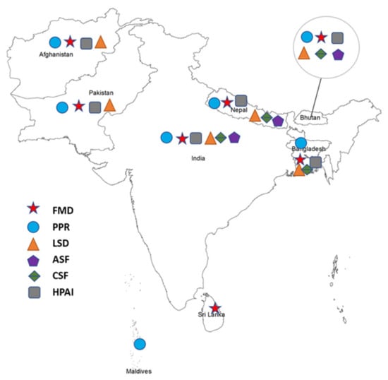 The present review was restricted to six transboundary animal diseases (TADs) of viral origin, namely, FMD, PPR, lumpy skin disease (LSD), ASF, CSF, and highly pathogenic avian influenza (HPAI). These TADs are notifiable diseases under the WOAH (OIE), and most countries in south Asia have identified them as notifiable animal diseases. The status of major TADs of viral origin in SAARC member countries is presented in