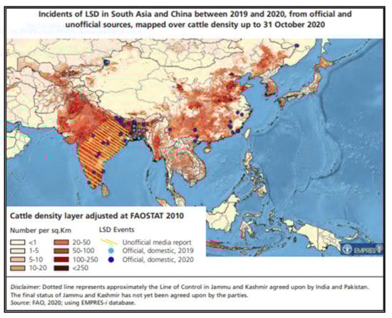 32]. The LSD outbreaks have been reported from remote and isolated island territories such as the Andaman and Nicobar in India, which is a matter of concern for island countries. FAO conducted a qualitative risk assessment of the likelihood of introduction and/or spread of LSD in 23 countries in South, East, and Southeast Asia covering the period October–December 2020, and the risk map of LSD is presented in