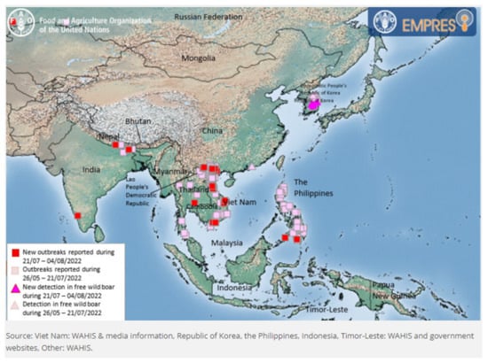 - African Swine Fever (ASF) Situation Updates in Asia & Pacific. Available online: https://www.fao.org/animal-health/situation-updates/asf-in-asia-pacific/en#:~:text=FAO%20warned%20of%20the%20risk,and%20preparedness%20measures%20%5Breference%5D (accessed on 10 August 2022).