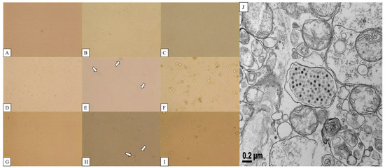 (A–C) Normal Vero cell; (D–F) CPE after inoculation of CAdV-2/18Ra-54; (G–I) CAdV-2/18Ra-65 in Vero cells and (J) the isolated CAdV-2/18Ra-54 observed with Bio-TEM.