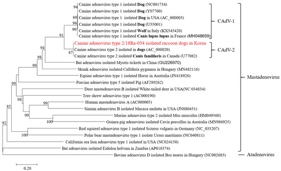Adenoviruses are classified into five genera, Atadenovirus, Aviadenovirus, Ichtadenovirus, Siadenovirus, and Mastadenovirus, according to the host species and various host-dependent clinical signs [7]. Mastadenovirus infections, including those of canine adenovirus types 1 and 2, manifest clinical signs in the respiratory and gastrointestinal tracts in mammals. CAdV-1 is known to cause infectious hepatitis, and the clinical symptoms include bladder edema, tonsillitis, and multiple vasculitis [8,9]. CAdV-2 is known as one of the causes of kennel cough—a type of cold—and clinical signs include cough, vomiting, lethargy, high fever, runny nose, and loss of appetite [10,11,12]. However, these characteristic clinical signs are not observed in raccoon dogs [13].