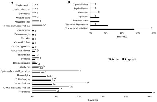(A) Occurrence of female reproductive tract disorders in ewes and does. (B) Occurrence of male reproductive tract disorders in rams and bucks. a, b, c, d, e, f Different letters among disorders in the same species indicate differences (Fisher’s exact test; p < 0.05); * Means difference between species (Fisher’s Exact Test; p < 0.05).