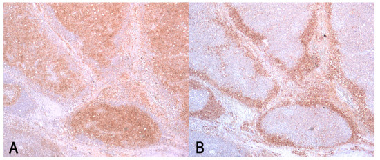 Diffuse large B-cell lymphoma (DLBCL) in mesenteric lymph node. (A) Plasma membrane CD79α-positive stain of neoplastic B cells. Immunolabeling with anti-CD79α; (B) CD3-negative stain of neoplastic cells; the neoplasia destroys the normal nodal architectures and the expansion of neoplastic cells in paracortex peripherally displaces the CD3-positive non-neoplastic T-cells. Immunolabeling with anti-CD3. (A,B) Magnification 40×.