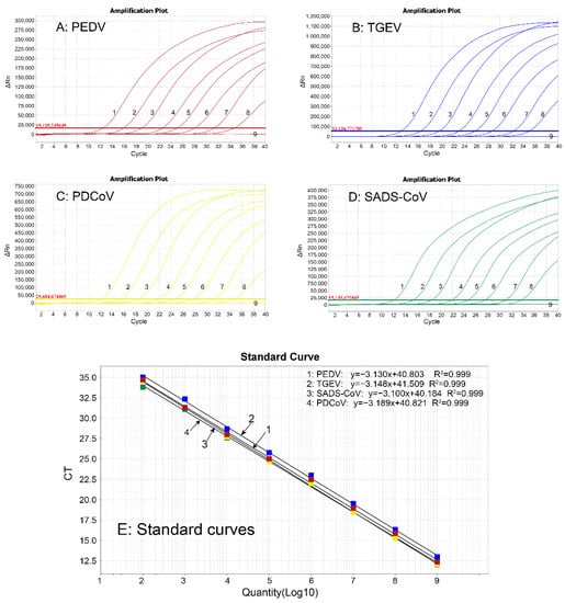 The PEDV and TGEV vaccines, PDCoV positive samples, synthesized plasmid containing SADS-CoV N gene (TaKaRa, Dalian, China) were used to construct the standard plasmids according to the procedure reported by Liu et al. [] with some modifications. The standard plasmids were named p-PEDV, p-TGEV, p-PDCoV, and p-SADS-CoV, respectively. The following formula was used to determine their concentration: = .